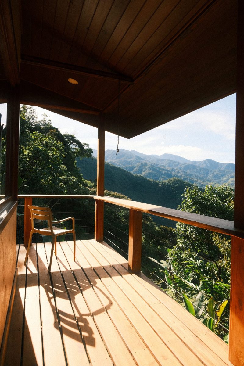Every room offers expansive views of the mountains and valleys from beautiful teak wood terraces. Rooms come equipped with pillow top high quality orthopedic mattresses and soft comfortable bedding. Cotton woven towels are provided for each guest. You will find writing desks for journaling in cabins: